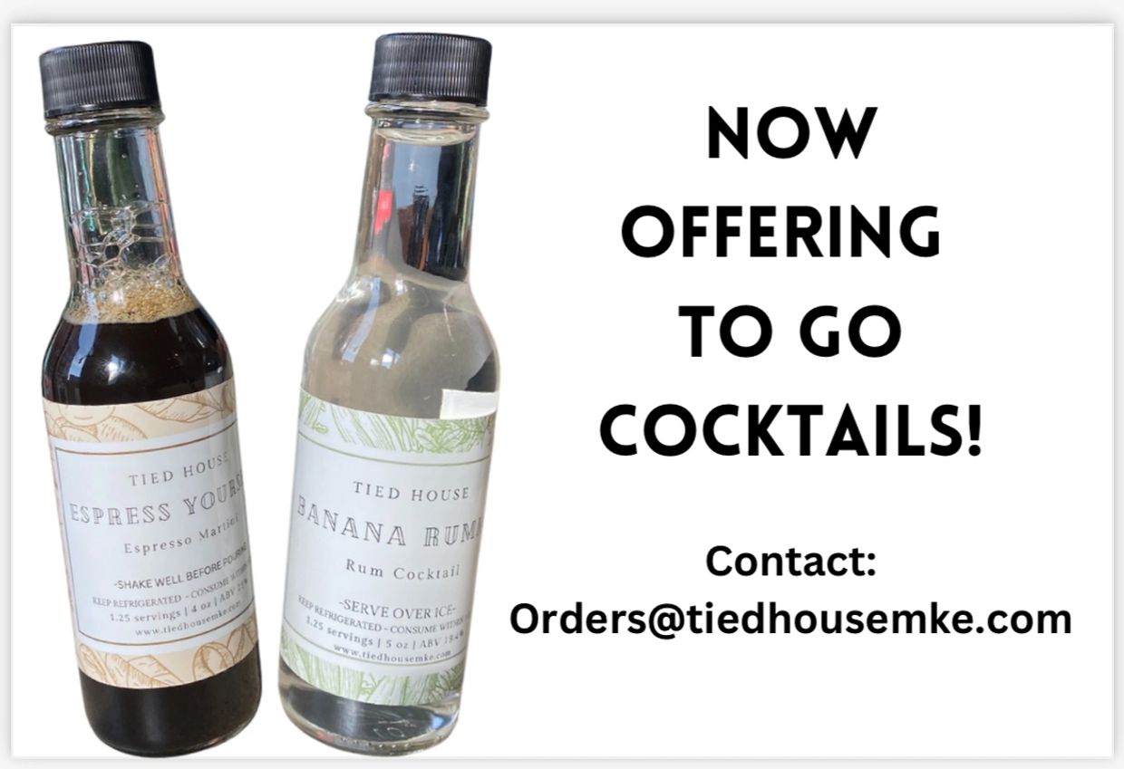 Our ”Classic Margarita“, “Banana Rumma” AND the “Espress Yourself” are available in 5oz bottles or 1.75 liter bottles To Go! For order placement and pick-up arrangement, simply contact: orders@tiedhousemke.com